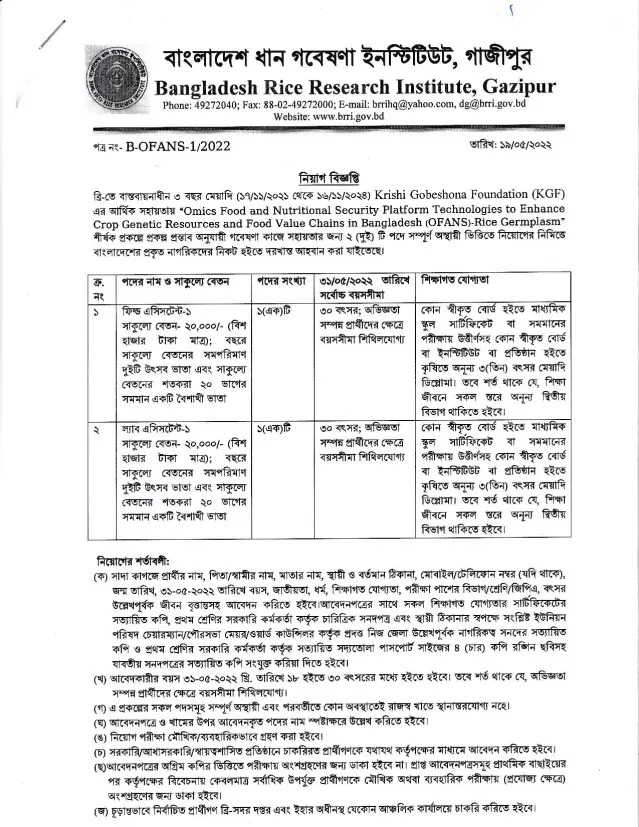 Bangladesh rice research institute BRRI this job circular may be a good chance for you if you want to a govt job in 2022. The good news is Bangladesh rice research institute will appoint a total of 05 People in the 02 posts. This is a huge chance for bd educated unemployed people.