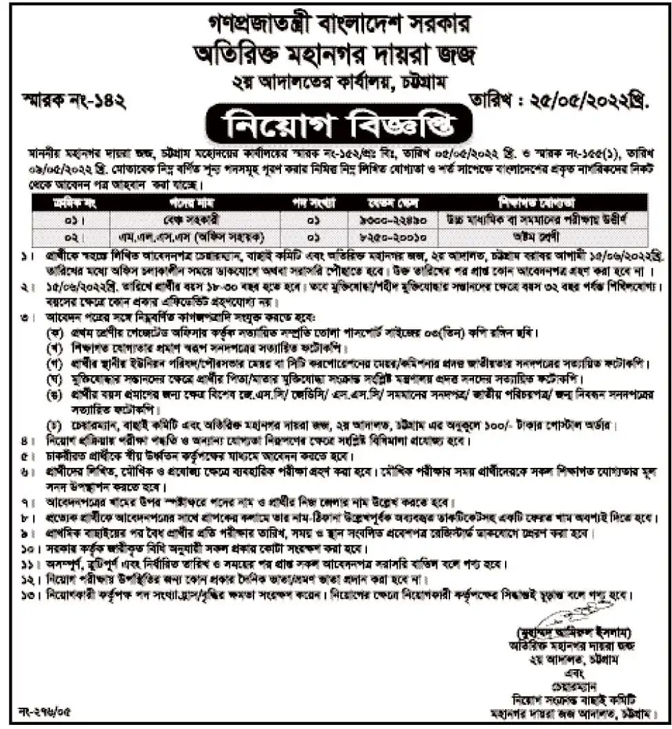 Chittagong Additional Metropolitan Judge Court Job Circular 2022