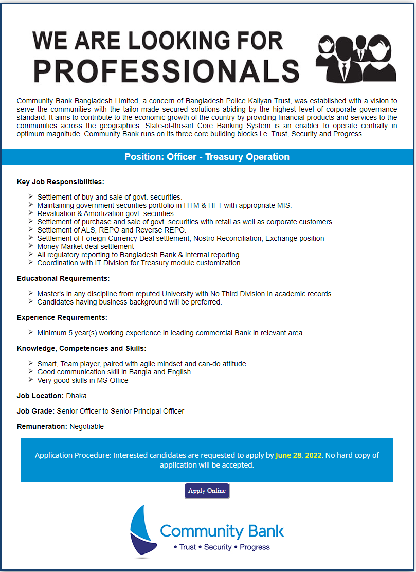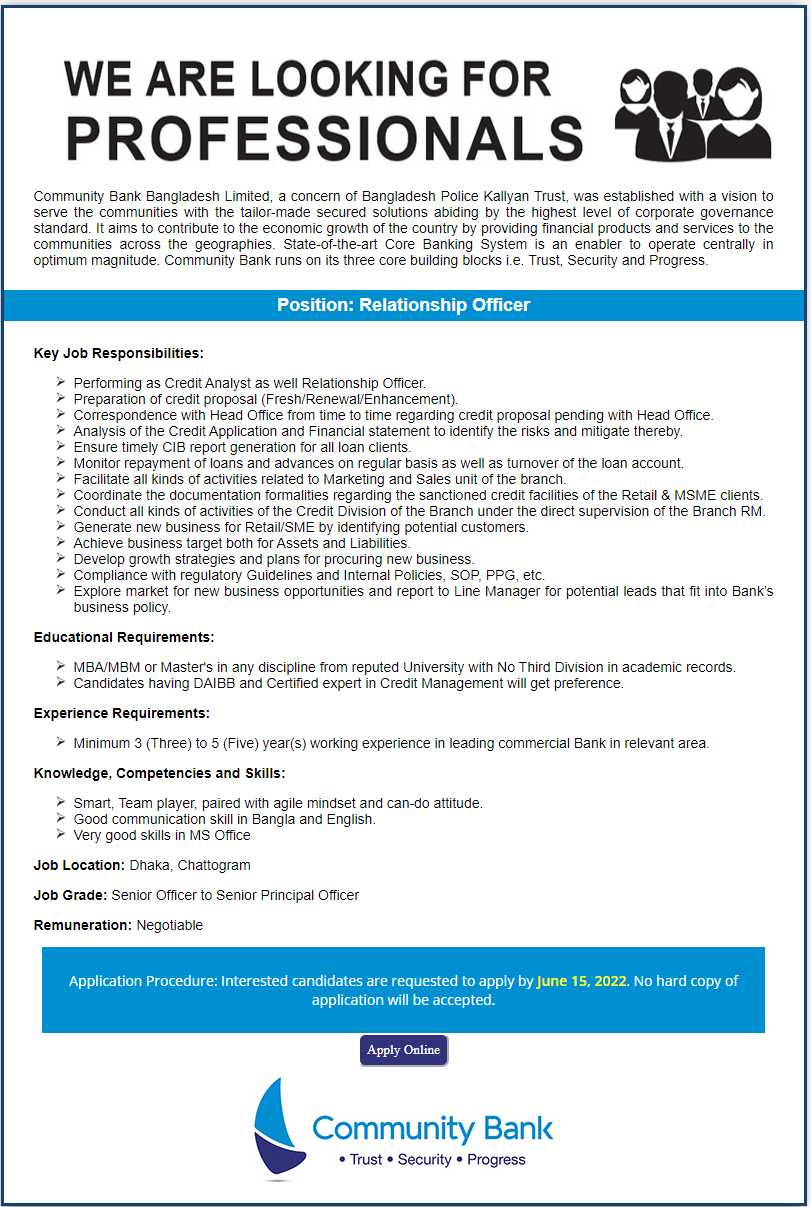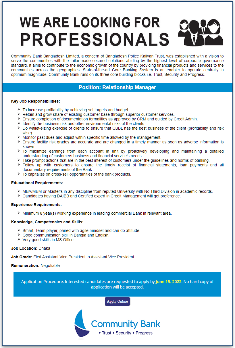 Community Bank Bangladesh Limited advertisement image is available on this page. You are able to download this recruitment notice from here. You will get details to know about the job circular from below. So please community Bank Ltd job circular 2022 below. Please share the job news if you think this appointment notice will help other Bangladesh job seekers.