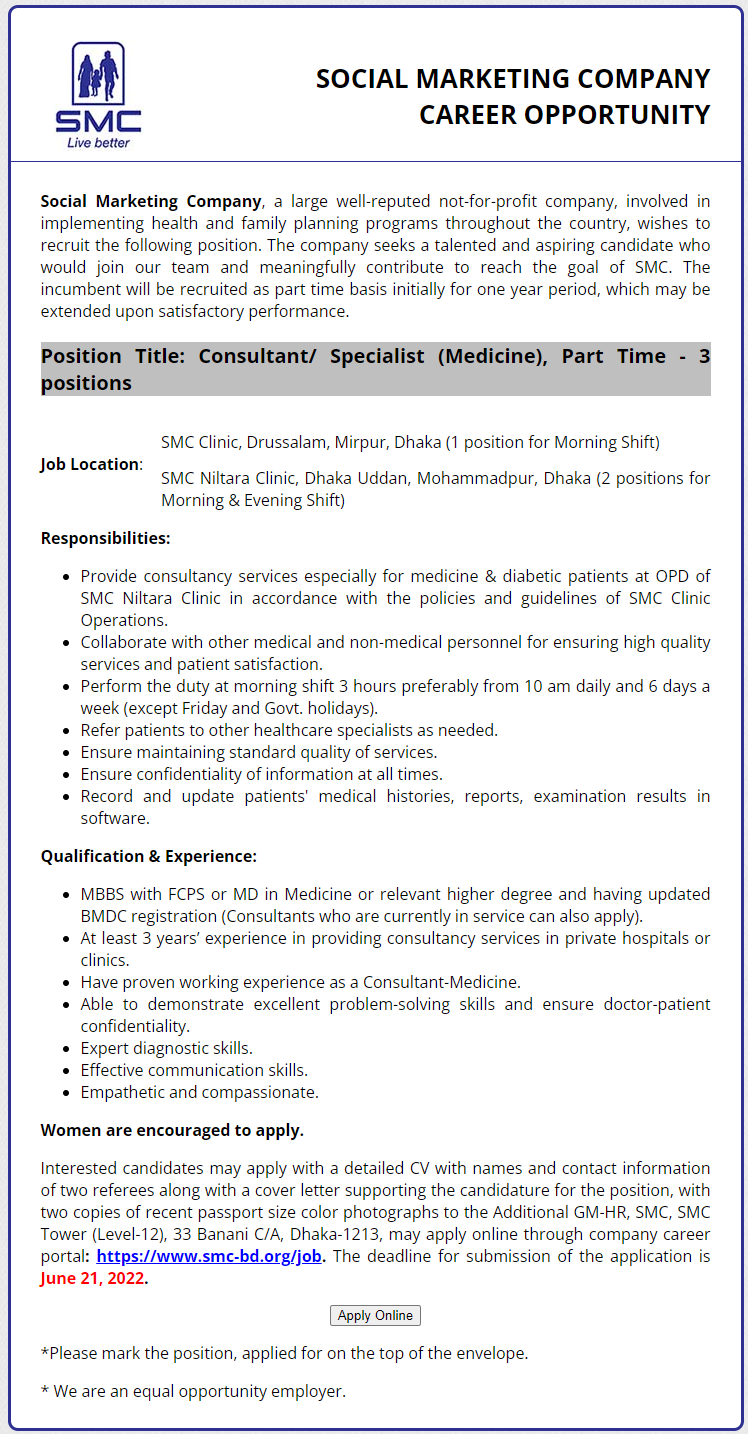 You get to know details from our website details SMC job circular of 2022 such as job applicational qualification and other qualification, job apply process, location, total post vacancy, total man vacancy, application apply the start date and last date, about Social Marketing Company, and other important things. So keep reading carefully if you have an interest in the Social Marketing Company job.