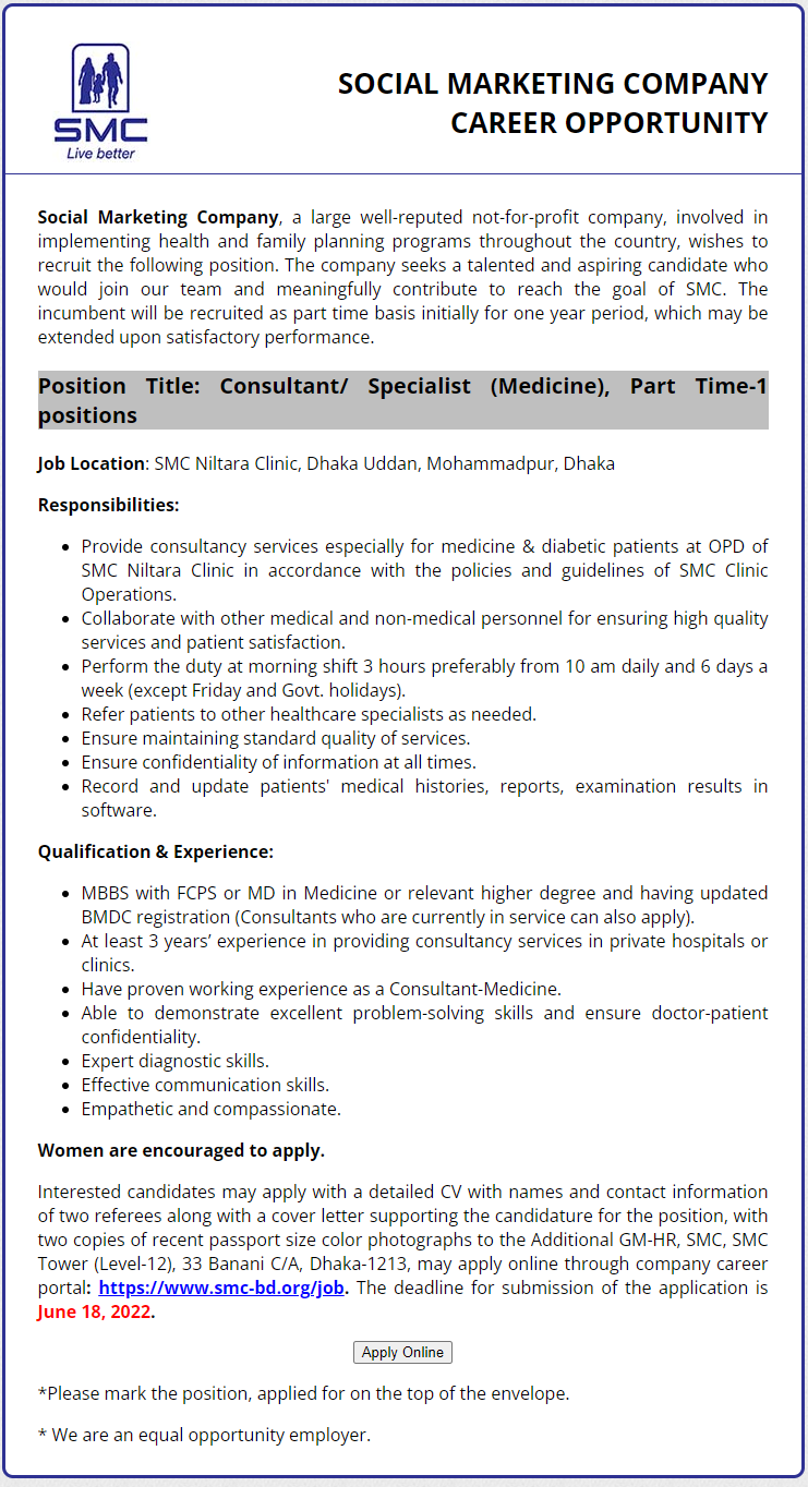 Social Marketing Company SMC Job application is very simple. You have to visit the official website and bdjobs.com website to send your job application. If you like or want a Private Company Job in 2022, then go to the authority website or bdjobs.com to submit your job application. You have to maintain the all role of the recruitment notice for the job application.